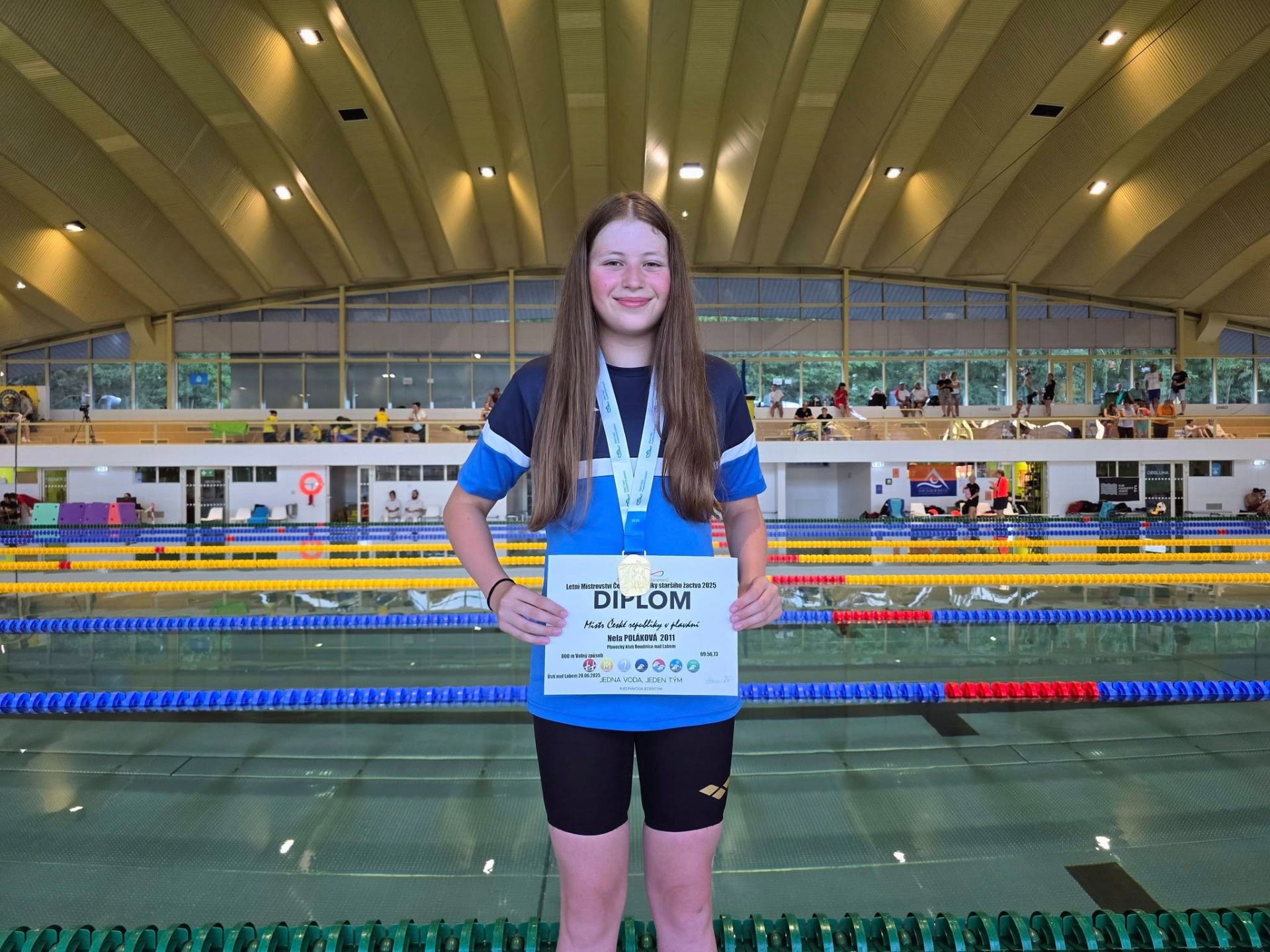 Nela Poláková zazářila na Mistrovství ČR staršího žactva, které se konalo poslední červnový víkend v Ústí nad Labem. Plavecký klub z Roudnice nad Labem má za sebou další velmi úspěšné vystoupení na celostátní scéně, které se konalo za účasti nejlepších mladých plavců z celé republiky. Největší radost udělala svému klubu i trenérům Nela Poláková, která si na trati 800 metrů volným způsobem doplavala pro zlatou medaili. Suverénní výkon od začátku až do konce jí zajistil titul mistryně České republiky a navíc splněný limit do SCM. Na 400 m volný způsob doplavala na 5 místě. Velmi dobře si vedl také Tobiáš Sedlmaier, který startoval v disciplínách – 200 metrů motýlek a 1500 metrů volný způsob. V obou závodech vybojoval shodně 4 místo . Stejně jako Nela totiž splnil limity pro zařazení do SCM. Na 100m motýlek doplaval na 5 místě. Na víc v celostátním srovnávacím DROP Cupu obsadil 5 místo. Zkušenosti sbíral také Matěj Ringelhán, který nastoupil v disciplíně 1500 metrů volný způsob vybojoval 15. místo, 200m motýlek 18 misto, 400m polohový závod 22 misto. I přes nelehký konec sezóny, jsme to zvládli
